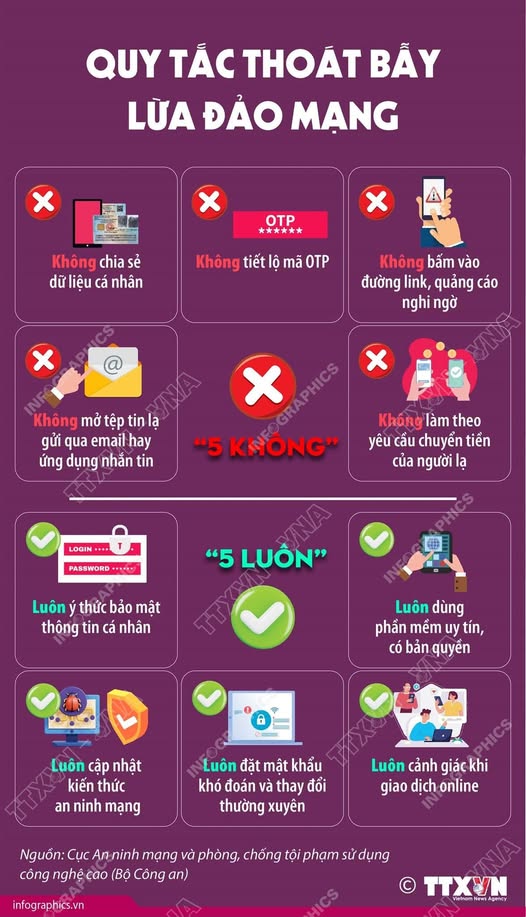 Những thủ đoạn như tin nhắn giả mạo ngân hàng, kêu gọi đầu tư AI siêu lợi nhuận, tuyển dụng công việc trực tuyến lương cao hay quà tặng ảo khiến nhiều người mất cảnh giác, dẫn đến mất tiền và dữ liệu cá nhân, thậm chí gây khủng hoảng tâm lý. Cục An ninh mạng và phòng, chống tội phạm sử dụng công nghệ cao - Bộ Công an đưa ra quy tắc “5 không” “5 luôn” để người dân tự bảo vệ trước chiêu trò lừa đảo online.