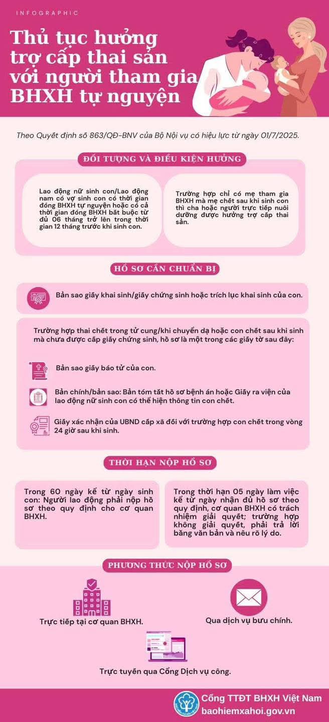Bạn là người tham gia BHXH tự nguyện. Từ ngày 01/7/2025, người tham gia BHXH tự nguyện sẽ được hưởng trợ cấp thai sản.
