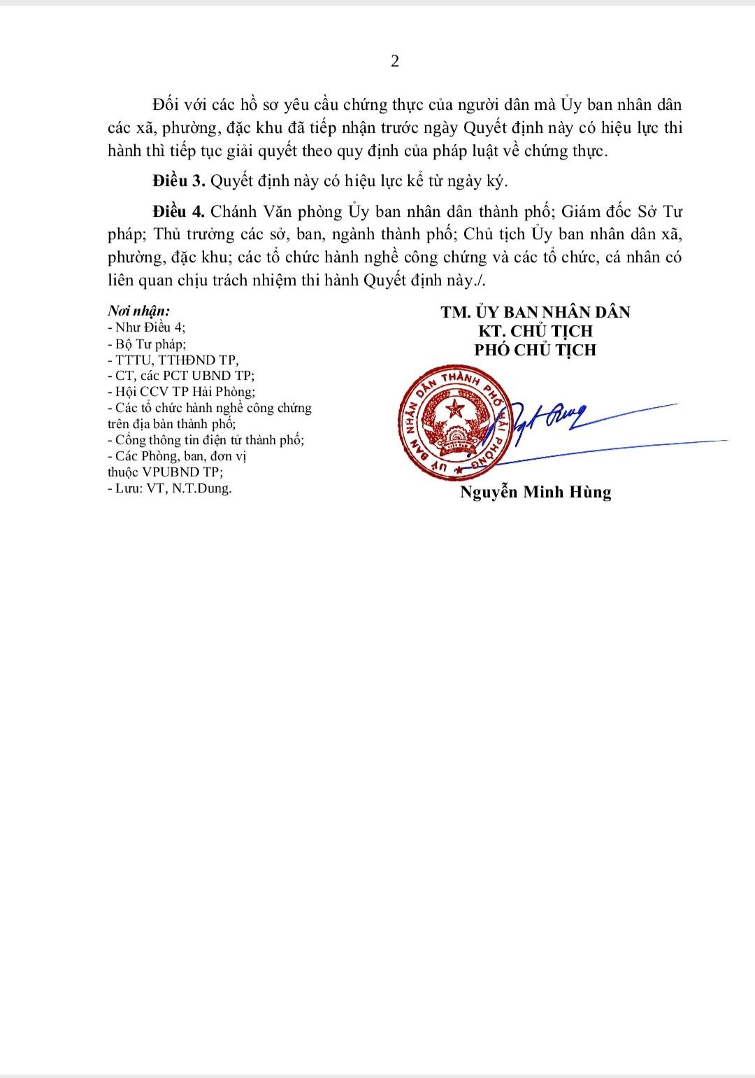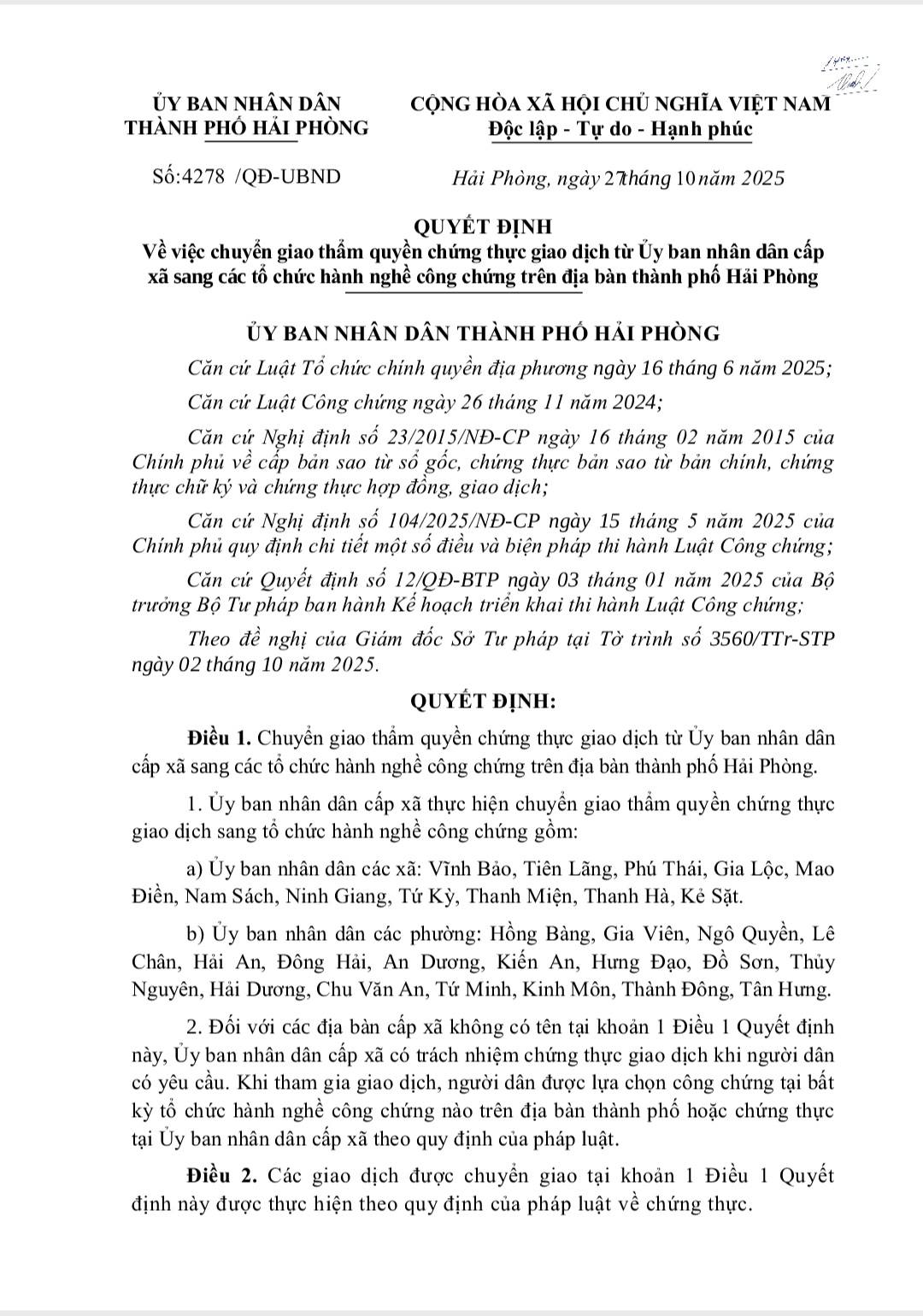 HẢI PHÒNG CHUYỂN GIAO THẨM QUYỀN CHỨNG THỰC GIAO DỊCH TỪ UBND MỘT SỐ XÃ, PHƯỜNG SANG CÁC TỔ CHỨC HÀNH NGHỀ CÔNG CHỨNG