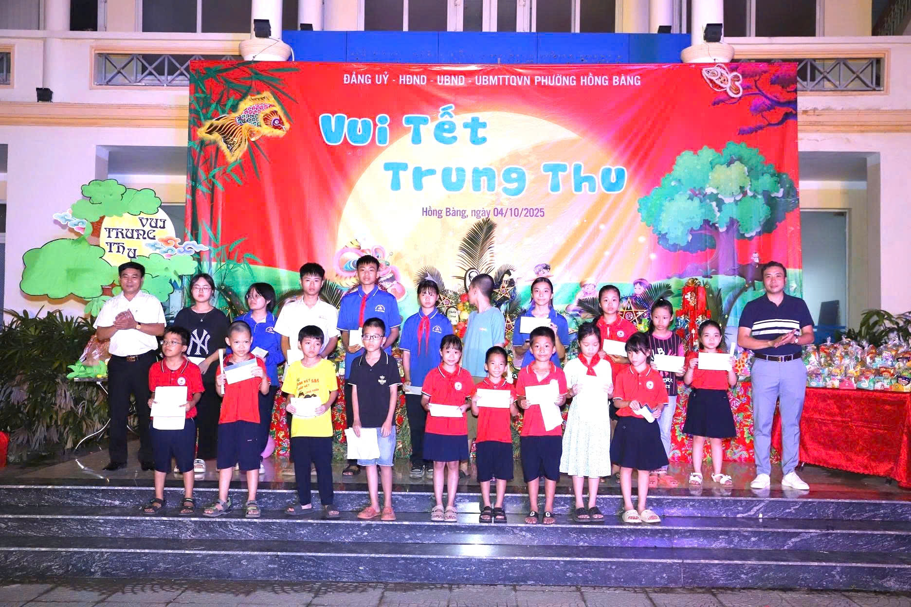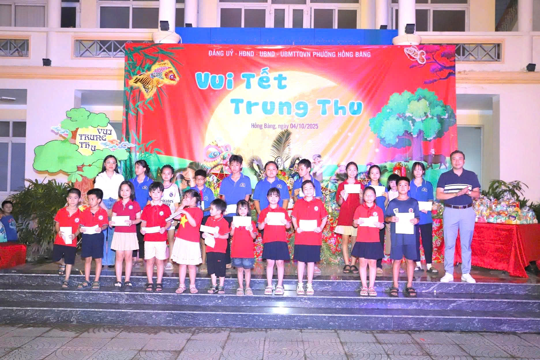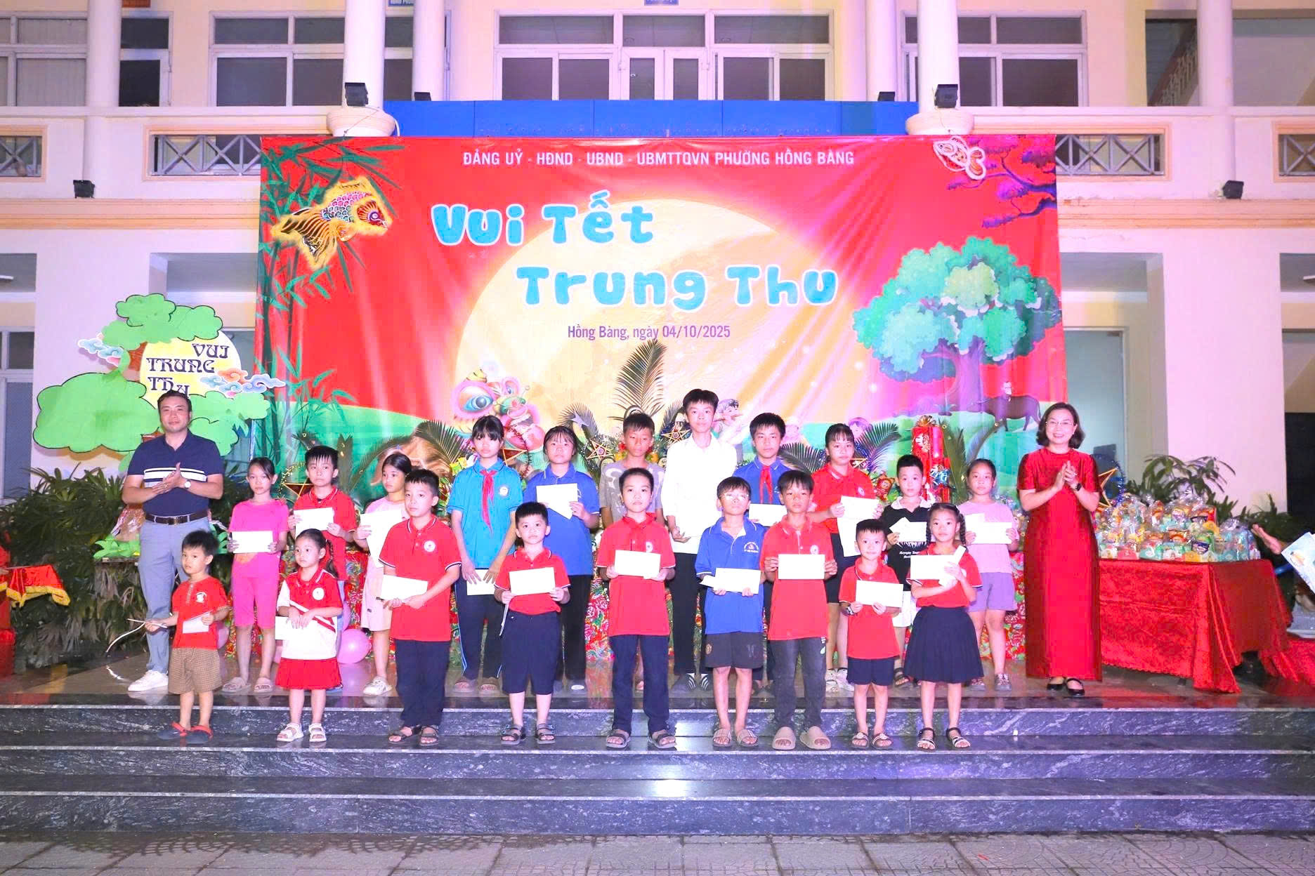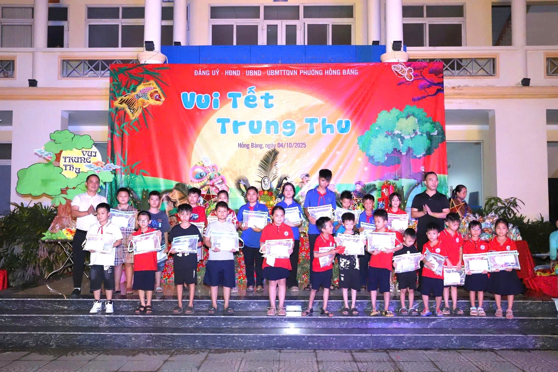 Tối ngày 4/10, trong không khí rộn ràng, hân hoan của ngày Tết Trung thu - Tết đoàn viên, Đảng ủy – HĐND – UBND - UBMTTQ phường Hồng Bàng tổ chức Chương trình “Vui Tết Trung thu - Trao học bổng và quà cho trẻ em có hoàn cảnh đặc biệt, khó khăn trên địa bàn phường” năm 2025. Đây là hoạt động có ý nghĩa thiết thực, thể hiện sự quan tâm của các cấp, các ngành và toàn xã hội đối với thế hệ măng non, đặc biệt là các em nhỏ có hoàn cảnh khó khăn trên địa bàn phường.