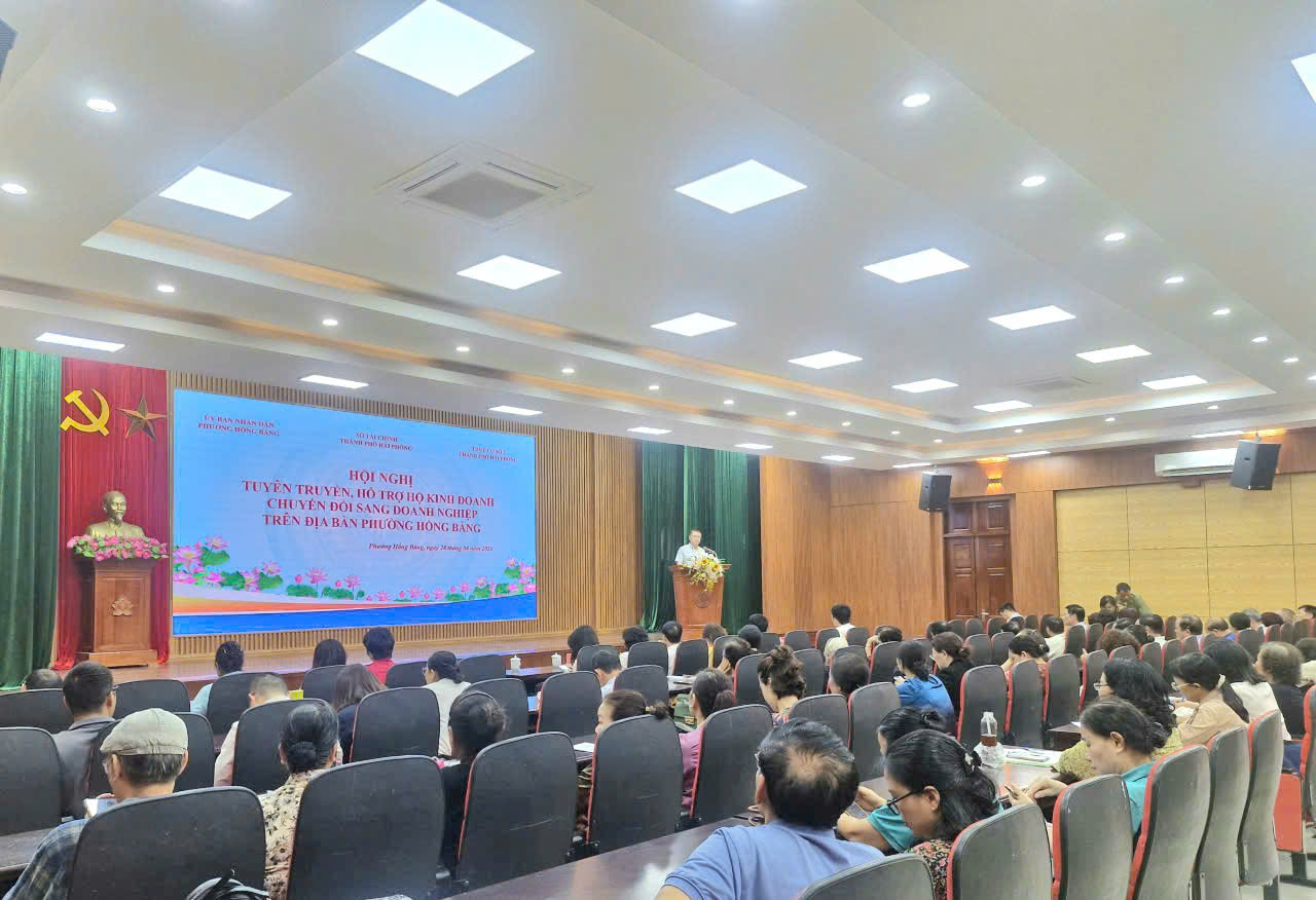 Thực hiện Kế hoạch số 173 ngày 26/7/2025 của UBND thành phố về thực hiện Nghị quyết số 138 ngày 16/5/2025 của Chính phủ và Kế hoạch hành động số 07 ngày 25/7/2025 của Ban Thường vụ Thành ủy thực hiện Nghị quyết số 68 ngày 04/5/2025 của Bộ Chính trị về phát triển kinh tế tư nhân tại thành phố Hải Phòng; Hôm nay, UBND phường Hồng Bàng phối hợp với Sở Tài chính, Thuế cơ sở 2 - thành phố Hải Phòng và các cơ quan, đơn vị liên quan tổ chức Hội nghị tuyên truyền, hỗ trợ hộ kinh doanh chuyển đổi thành doanh nghiệp trên địa bàn phường, nhằm hướng dẫn hộ kinh doanh các nghiệp vụ, chính sách được thụ hưởng về thuế, ngân hàng, nền tảng số, chuyển đổi số… khi hộ kinh doanh chuyển đổi thành doanh nghiệp.