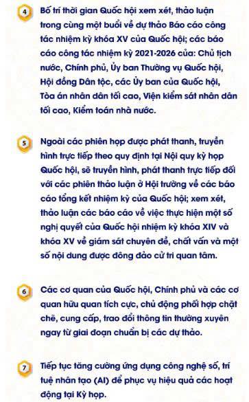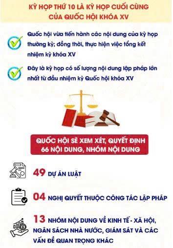 Kỳ họp thứ 10, Quốc hội khóa XV sẽ khai mạc trọng thể sáng 20/10 tại Hội trường Diên Hồng, Nhà Quốc hội, Hà Nội. Kỳ họp này Quốc hội sẽ xem xét, thông qua nội dung lập pháp lớn nhất từ đầu nhiệm kỳ. Do khối lượng công việc lớn kỷ lục nên phương thức tổ chức kỳ họp có nhiều thay đổi về cách làm, cải tiến quy trình, cách điều hành để đảm bảo yêu cầu, trong đó sẽ tăng cường ứng dụng công nghệ số, trí tuệ nhân tạo (AI) để phục vụ hiệu quả các hoạt động tại Kỳ họp.