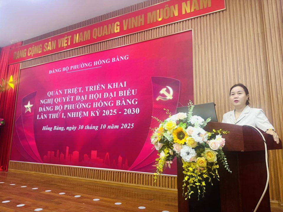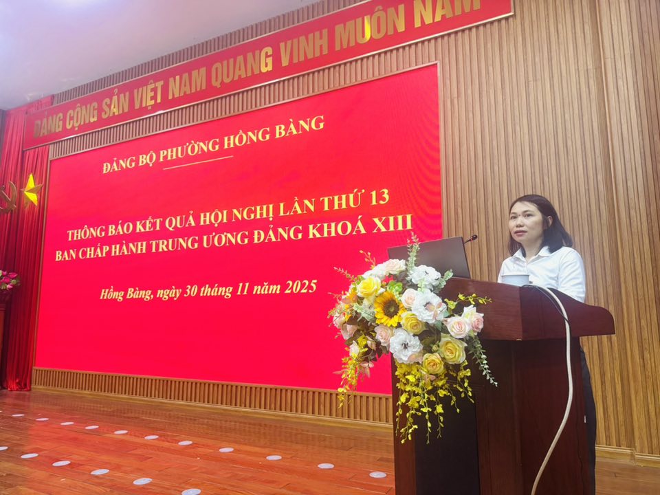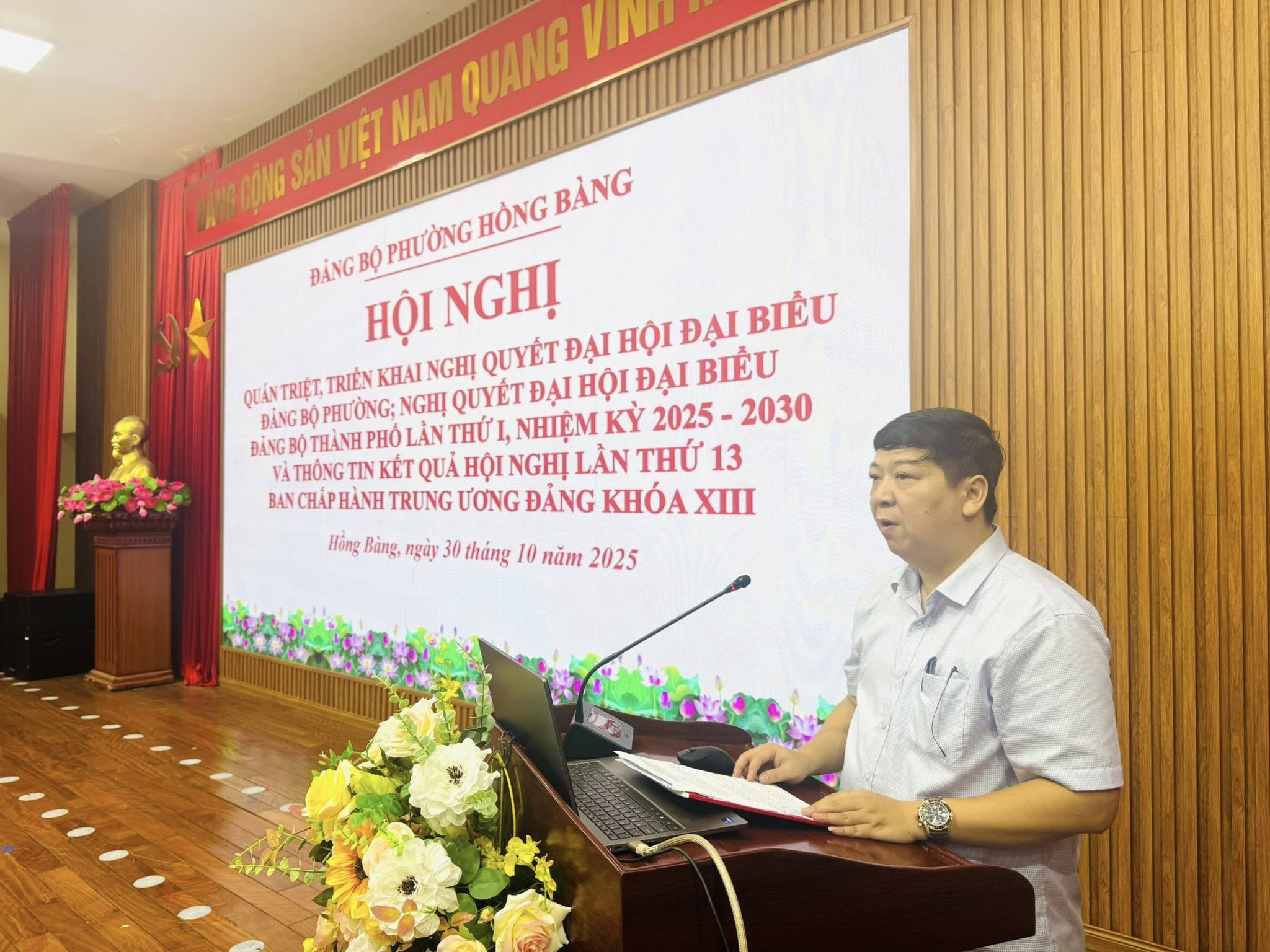 PHƯỜNG HỒNG BÀNG TỔ CHỨC HỘI NGHỊ TUYÊN TRUYỀN, QUÁN TRIỆT VÀ TRIỂN KHAI NGHỊ QUYẾT ĐẠI HỘI ĐẢNG BỘ PHƯỜNG HỒNG BÀNG; NGHỊ QUYẾT ĐẠI HỘI ĐẢNG BỘ THÀNH PHỐ LẦN THỨ I, NHIỆM KỲ 2025 - 2030 VÀ THÔNG BÁO KẾT QUẢ HỘI NGHỊ LẦN THỨ 13 BAN CHẤP HÀNH TRUNG ƯƠNG ĐẢNG KHÓA XIII