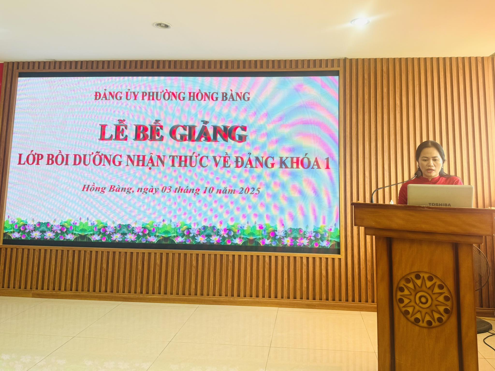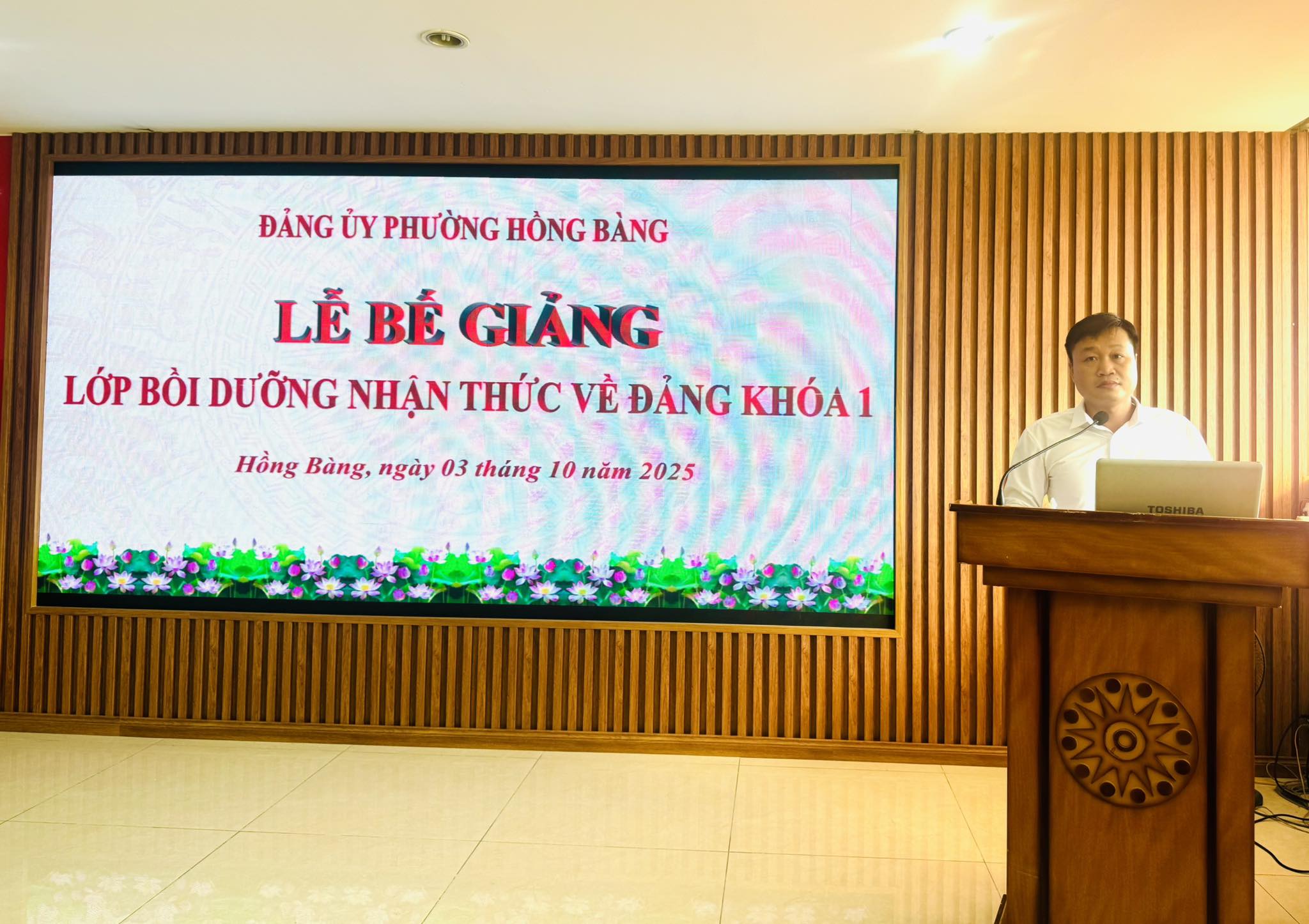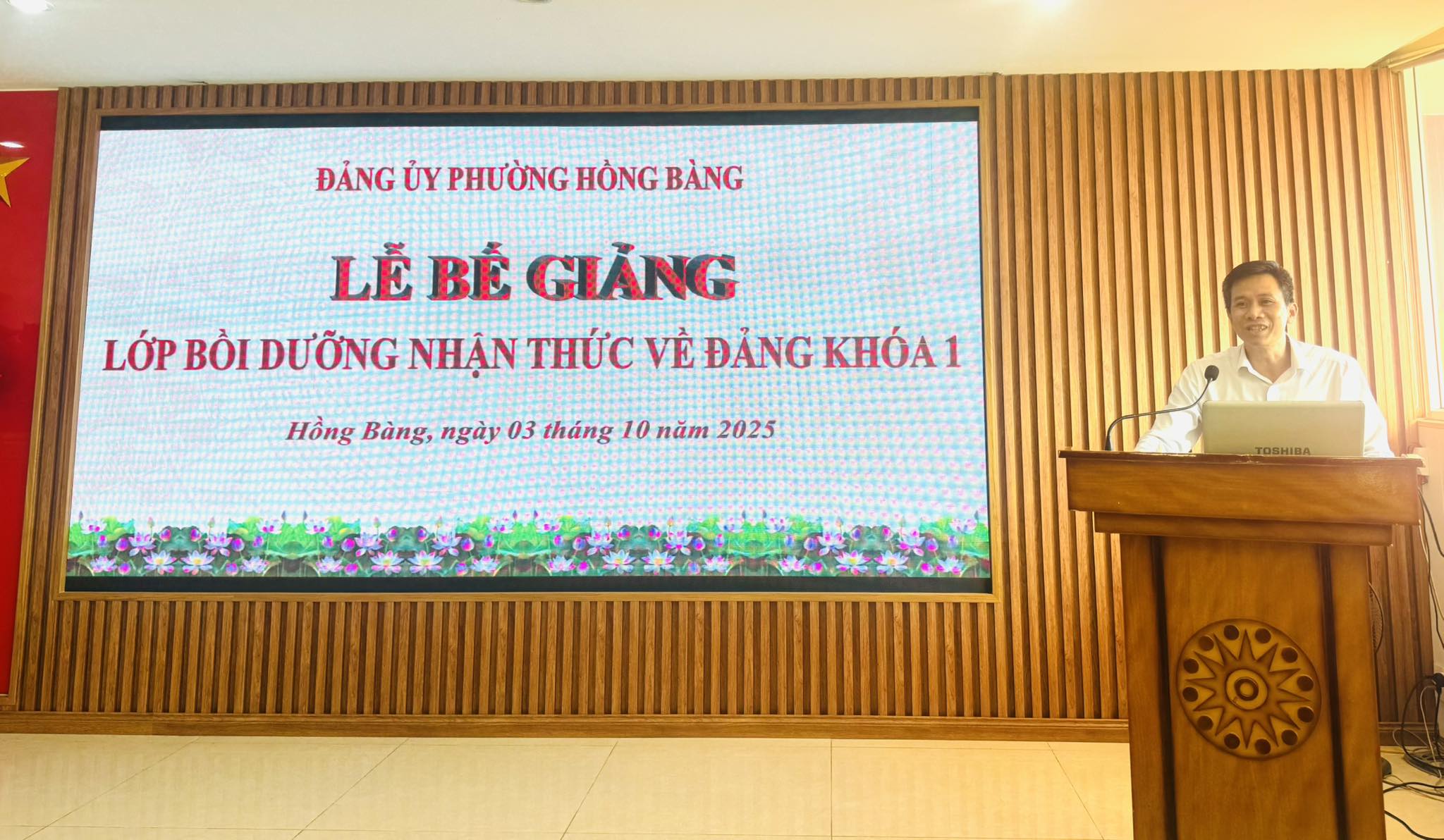 Lớp bồi dưỡng nhận thức về Đảng khóa 1 phường Hồng Bàng đã diễn ra theo đúng kế hoạch từ ngày 30/9/2025 đến ngày 03/10/2025. Chiều ngày 03/10/2025, Đảng ủy phường Hồng Bàng tổ chức Lễ bế giảng lớp học tại Trung tâm Chính trị phường.