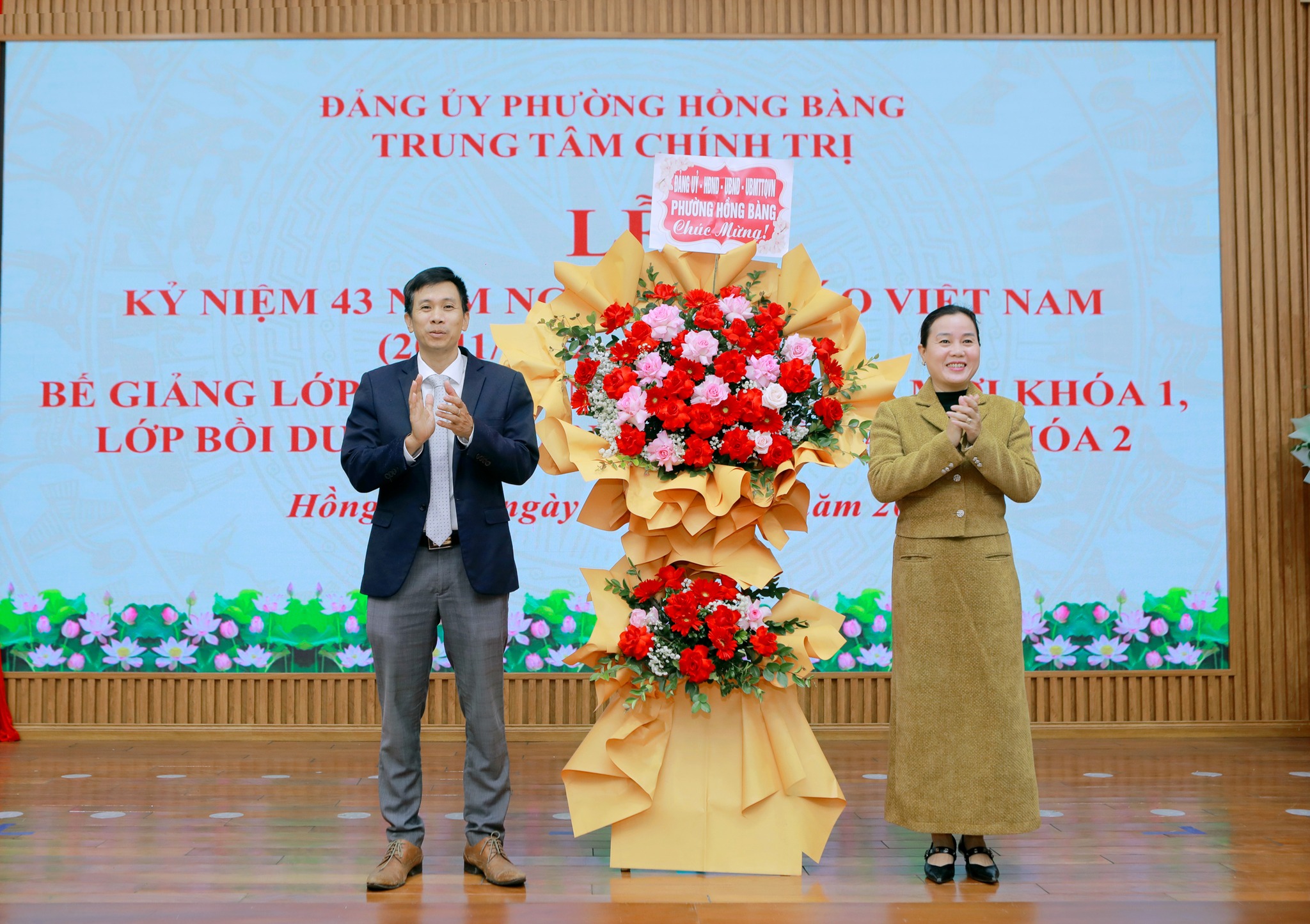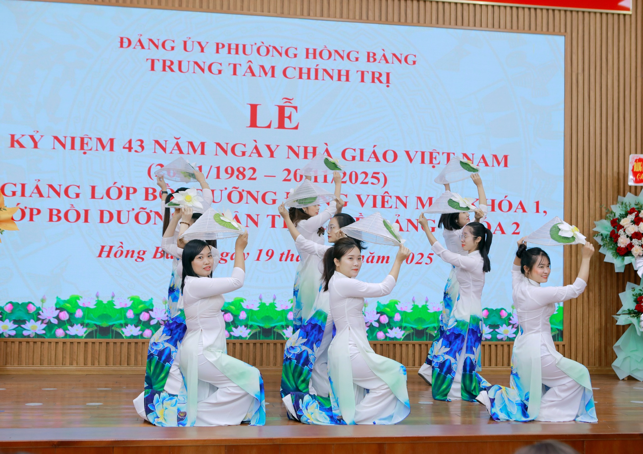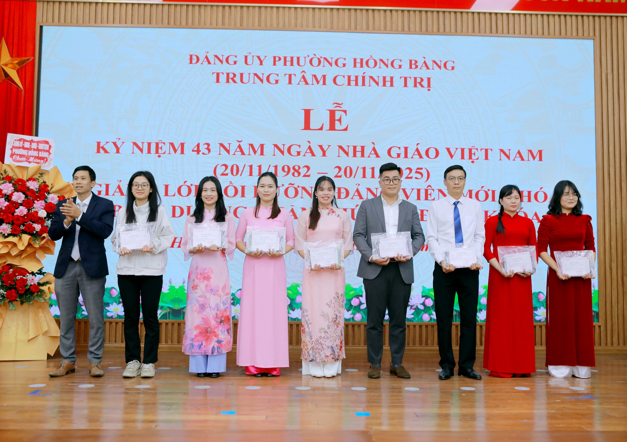 Trong không khí sôi nổi cùng cả nước hướng về kỷ niệm 43 năm ngày Nhà giáo Việt Nam (20/11/1982 - 20/11/2025), nhằm tri ân sự đóng góp các giảng viên trong công tác giảng dạy của Trung tâm chính trị phường và đánh giá kết quả học tập của khóa học Bồi dưỡng đảng viên mới K1 và lớp nhận thức về Đảng khóa 2. Sáng ngày 19/11/2025, Đảng ủy phường Hồng Bàng đã chỉ đạo Trung tâm Bồi dưỡng chính trị phường tổ chức Lễ kỷ niệm 43 năm ngày Nhà giáo Việt Nam và bế giảng lớp Bồi dưỡng đảng viên mới khóa 1 và nhận thức về Đảng khóa 2.