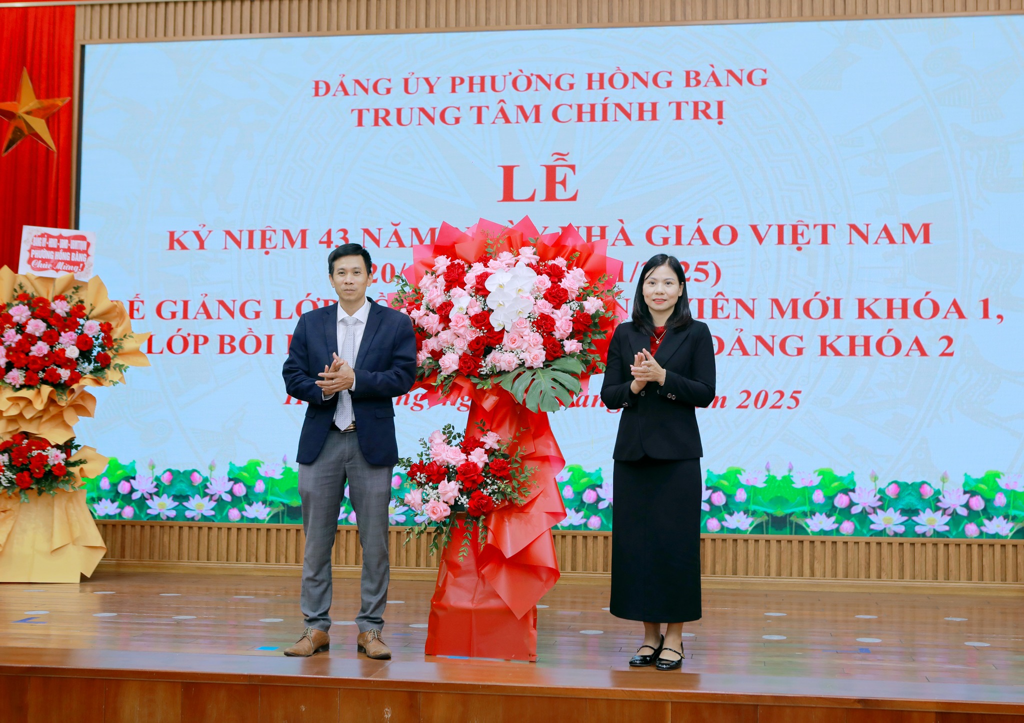 Tại buổi lễ, lãnh đạo Đảng ủy phường Hồng Bàng cùng đại diện các đơn vị đã tặng hoa chúc mừng Ngày Nhà giáo Việt Nam 20/11 và tri ân các thầy cô giảng viên Trung tâm Chính trị. Nhân dịp này, đồng chí Lê Thị Vân- Phó Bí thư Thường trực Đảng ủy, Chủ tịch HĐND phường đã thay mặt Đảng ủy - HĐND - UBND - Ủy ban MTTQ Việt Nam phường gửi lời chúc mừng và biểu dương các thầy cô giáo trong công tác bồi dưỡng, nâng cao nhận thức về Đảng cho quần chúng ưu tú và đảng viên mới.