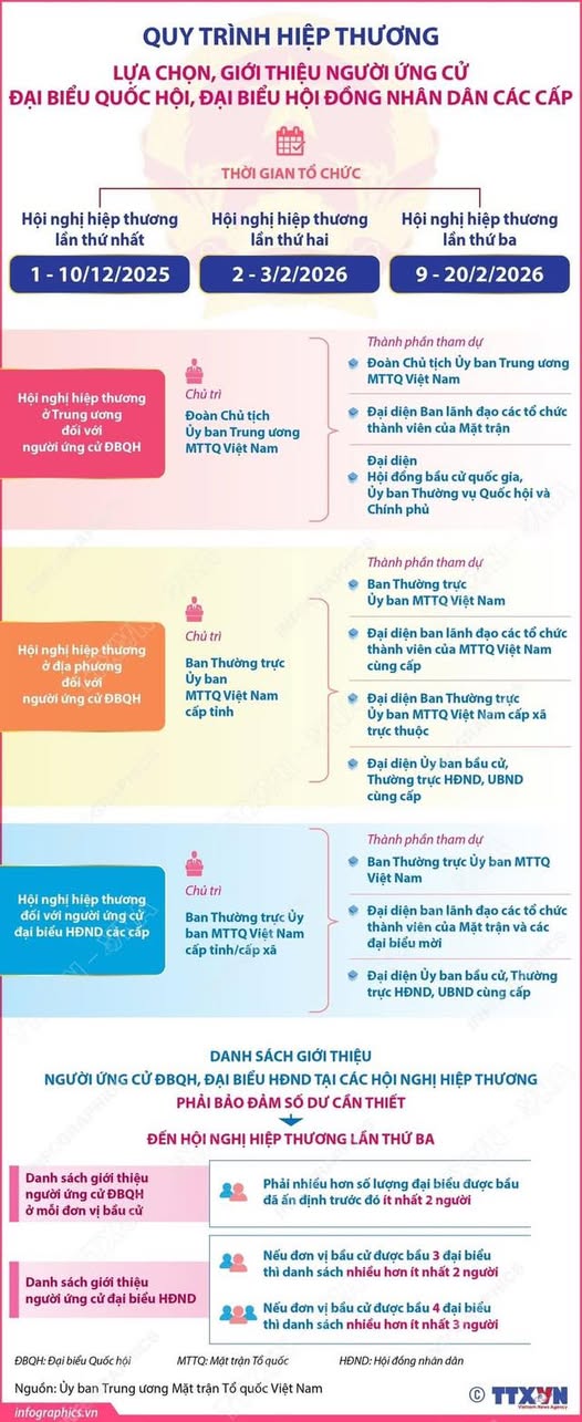 Tại Hội nghị toàn quốc quán triệt Chỉ thị của Bộ Chính trị, triển khai công tác bầu cử đại biểu Quốc hội Khóa XVI và đại biểu Hội đồng Nhân dân các cấp nhiệm kỳ 2026-2031 tổ chức ngày 15/11/2025, bà Nguyễn Thị Thu Hà, Ủy viên Trung ương Đảng, Phó Chủ tịch - Tổng Thư ký Ủy ban Trung ương MTTQ Việt Nam đã trình bày chuyên đề về “Quy trình hiệp thương lựa chọn, giới thiệu người ứng cử đại biểu Quốc hội, đại biểu Hội đồng nhân dân các cấp và việc tổ chức các hội nghị lấy ý kiến cử tri”. Theo đó, Hội nghị hiệp thương sẽ được tiến hành ba lần, cụ thể là: Hội nghị hiệp thương lần thứ nhất ở mỗi cấp được tổ chức từ ngày 1/12/2025 đến ngày 10/12/2025. Hội nghị hiệp thương lần thứ hai tổ chức từ ngày 2/2/2026 đến ngày 3/2/2026. Hội nghị hiệp thương lần thứ ba tổ chức từ ngày 9/2/2026 đến ngày 20/2/2026.