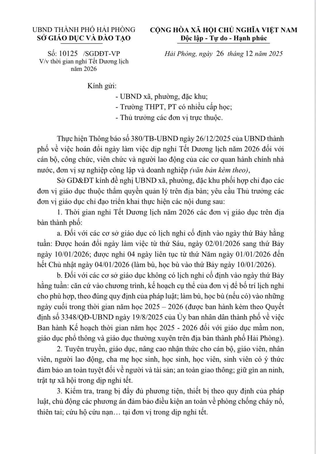 THỜI GIAN NGHỈ TẾT DƯƠNG LỊCH 2026 CỦA HỌC SINH HẢI PHÒNG