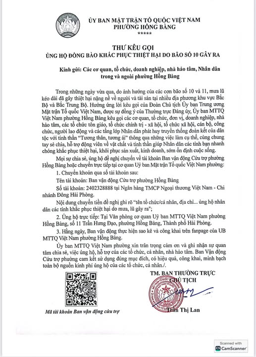 Thư kêu gọi ủng hộ đồng bào bị thiệt hại do Bão số 10 gây ra của Ủy ban MTTQVN phường Hồng Bàng