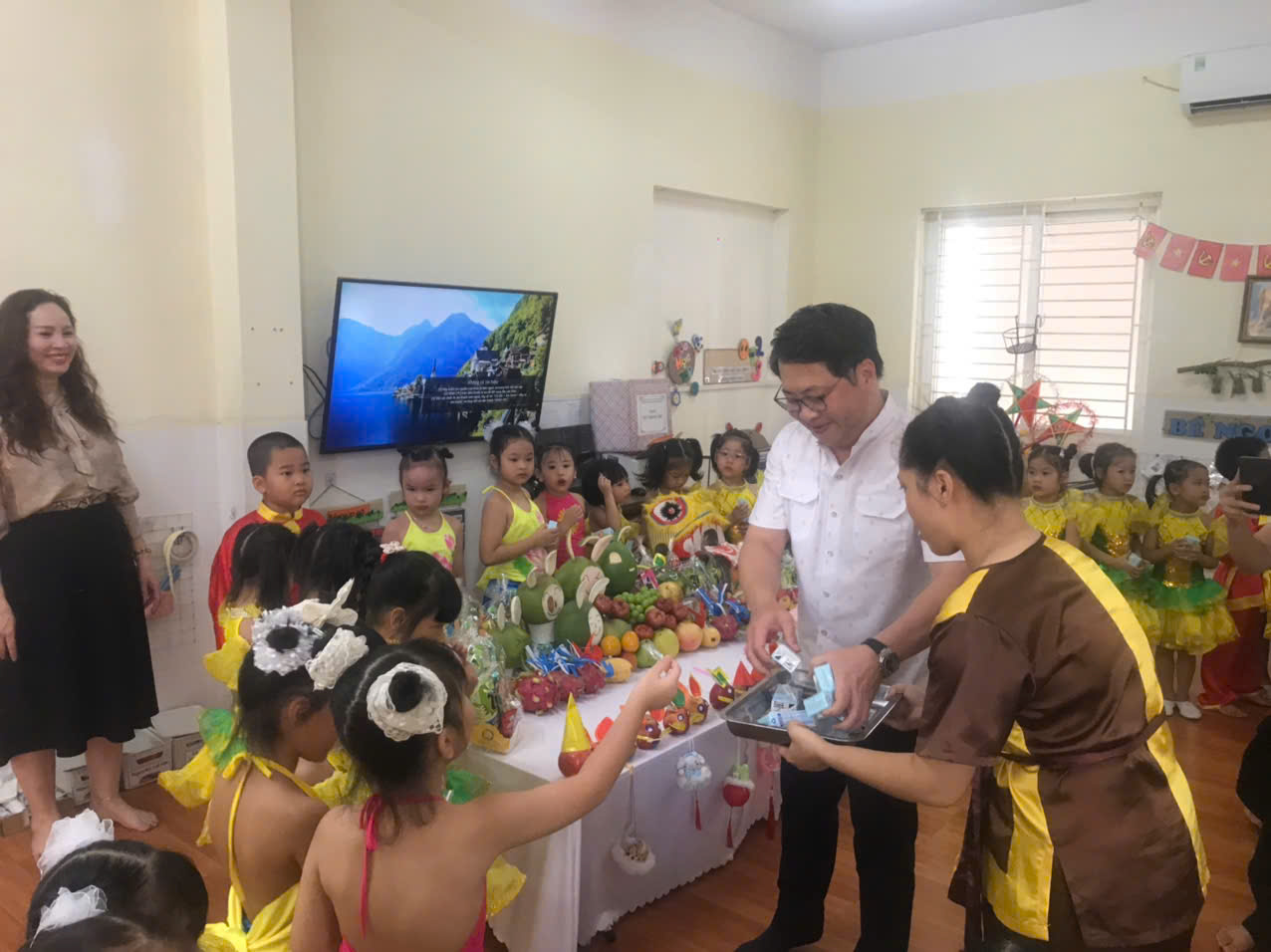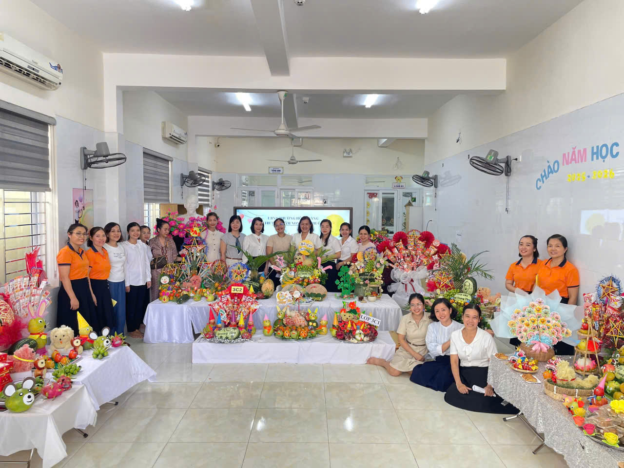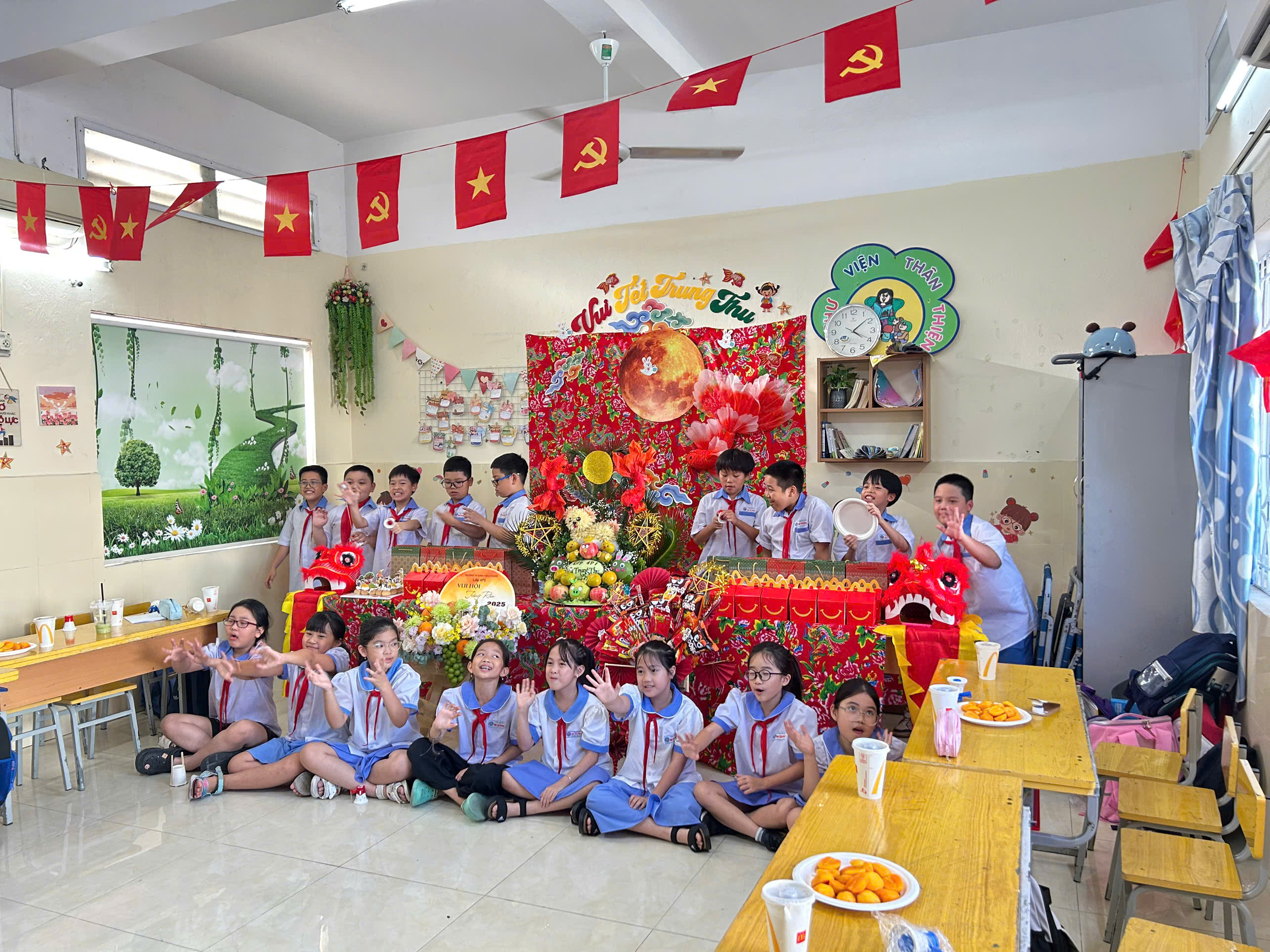 Những mâm cỗ Trung thu đầy đủ bánh nướng, hoa quả và nhiều món quà ngọt ngào đã mang lại niềm vui trọn vẹn cho các bé. Các em cùng nhau phá cỗ, thưởng thức hương vị Trung thu truyền thống trong tiếng cười giòn giã, ánh mắt rạng rỡ.